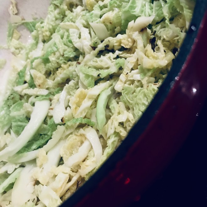 Den Wirsing in feine Streifen schneiden und in einer Ofenfesten Topf mit etwas Olivenöl und Salz weich dünsten.