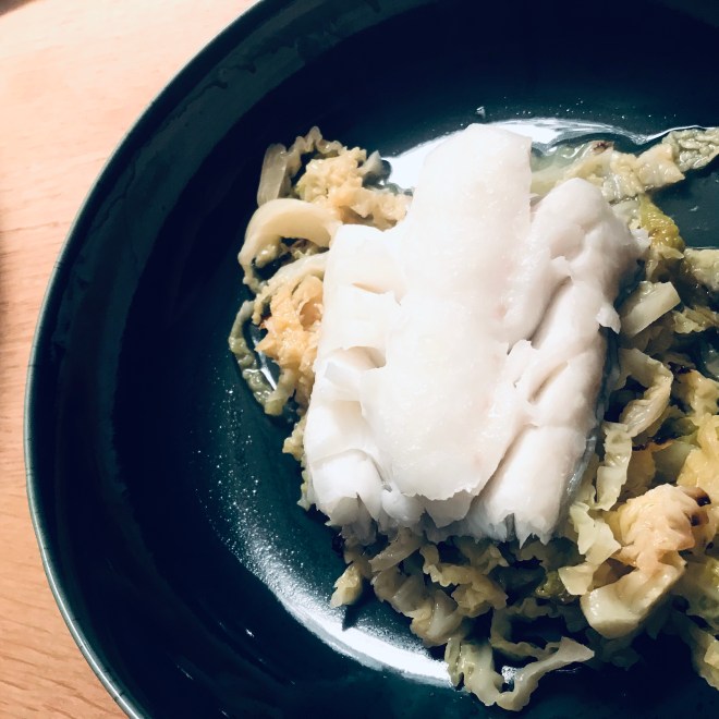 Der Fisch ist gar wenn er noch leicht glasig ist. Nun den Fisch und den Wirsing aus dem Topf entfernen und den Kochsud leicht einkochen und mit etwas kalter Butter zu einer sämigen Sauce binden.
