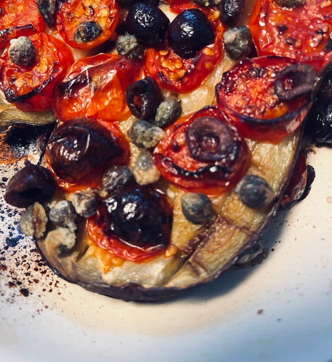 In der Zwischenzeit sowohl die Kirschtomaten als auch die getrockneten Tomaten in Streifen schneiden und zusammen mit den Kapern und den Oliven auf den Auberginen verteilen.