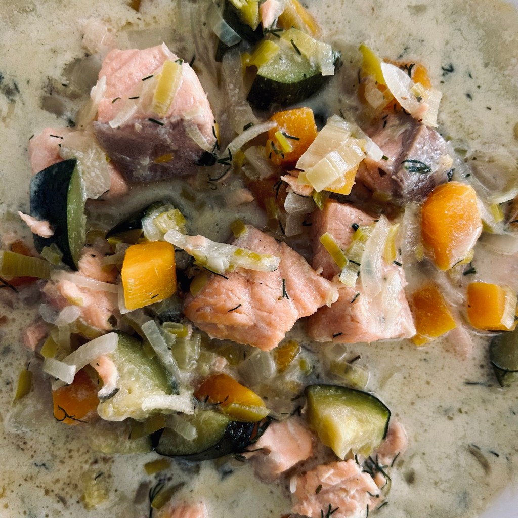 Sobald das Gemüse weich ist, die Hitze reduzieren, den gewürfelten Lachs dazugeben und in der Suppe so lange ziehen lassen bis er gar ist.