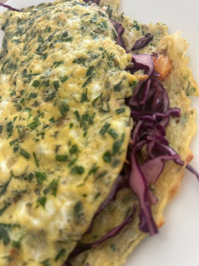 Die Omeletten mit dem Rotkohlsalat füllen und mit Guacamole servieren.