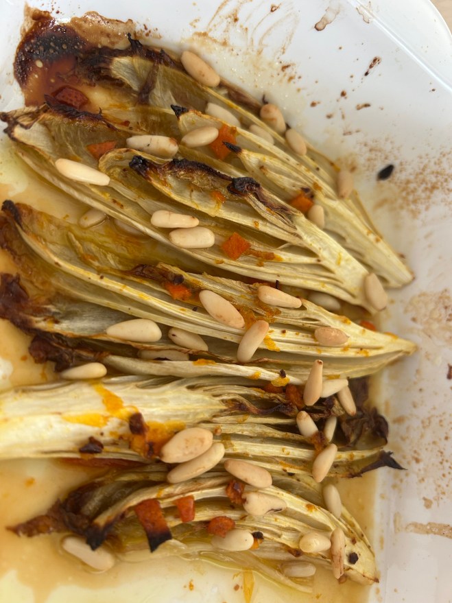 Die Marinade über den Chicorée geben und 2-3 Esslöffel Pinienkerne darüber streuen.