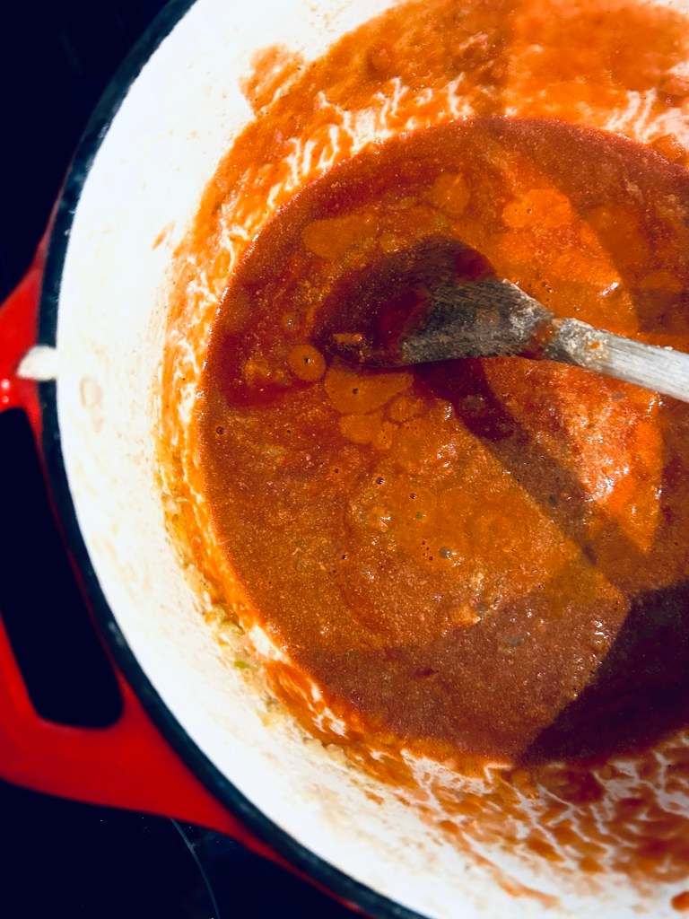 Nun das Tomatenpüree, sowie den Doppelrahm und eine Tasse Wasser dazugeben, gut umrühren und mit Salz und bisschen Zucker abschmecken.